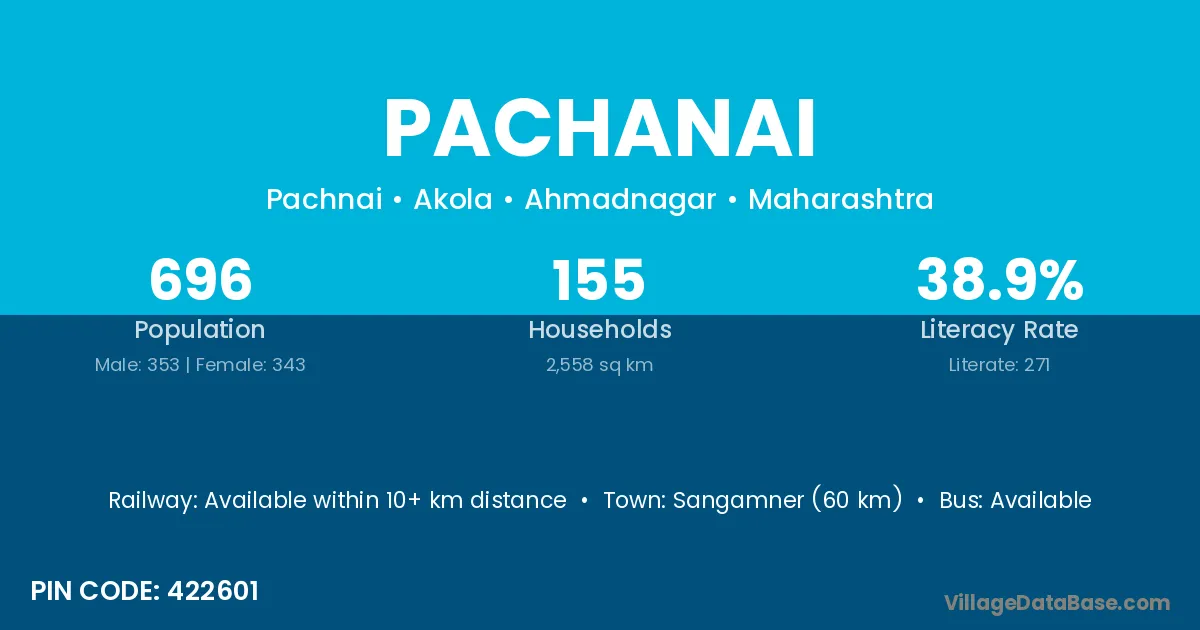 Sangamner (60 km) is the nearest town to Pachanai village for major economic activities and is located approximately 60 km away.