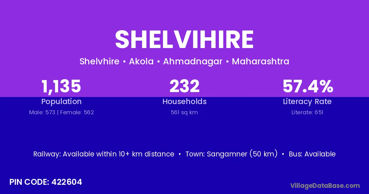 Sangamner (50 km) is the nearest town to Shelvihire village for major economic activities and is located approximately 50 km away.