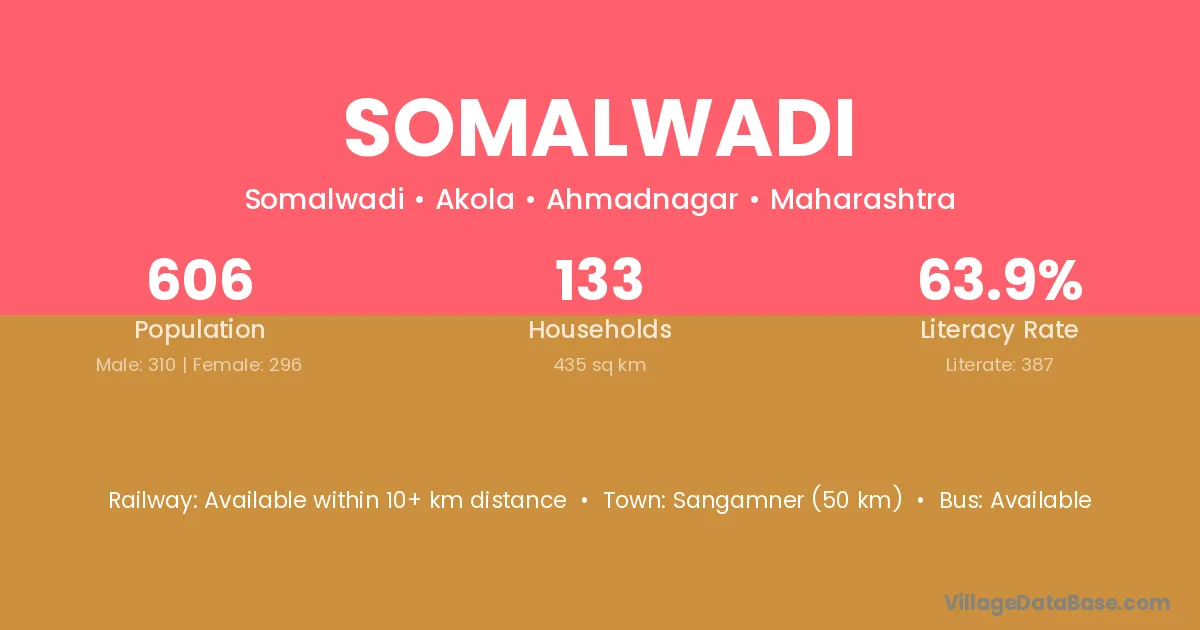 Somalwadi village has a total population of 606 people, of which 310 are males and 296 are females.