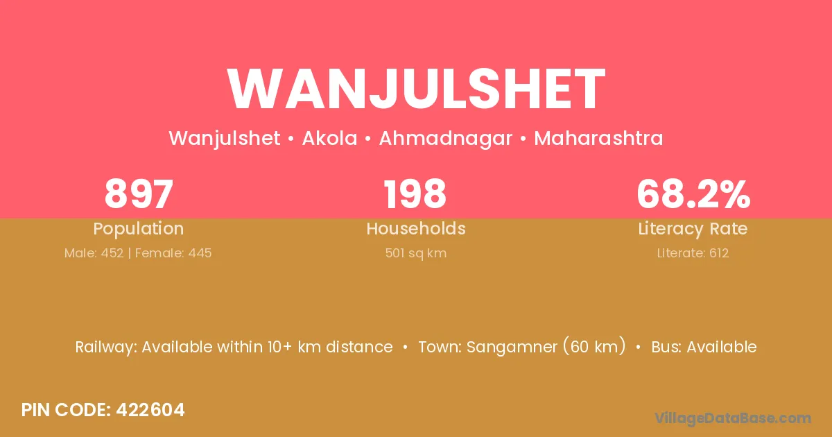 Sangamner (60 km) is the nearest town to Wanjulshet village for major economic activities and is located approximately 60 km away.