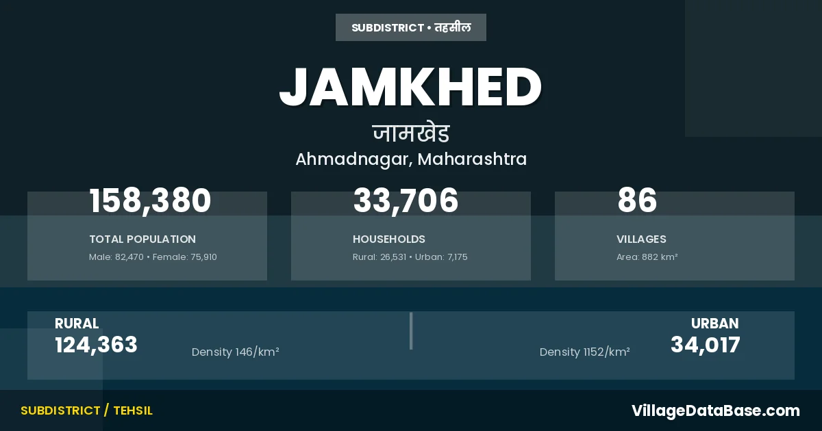 According to the 2011 census The total area of Jamkhed Tehsil is 882 km², with a population of 158380 people. The population density is 180 inhabitants per square kilometre, and there are approximately 33706 houses in the sub district.