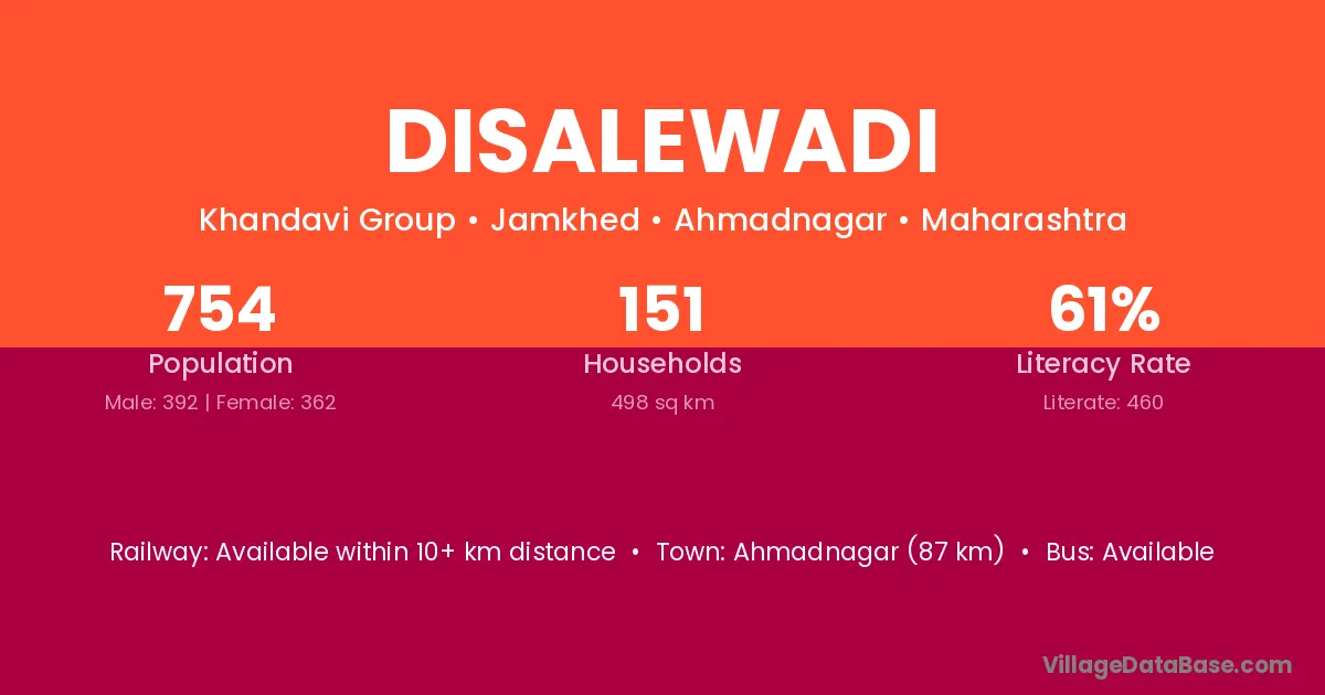 Ahmadnagar (87 km) is the nearest town to Disalewadi village for major economic activities and is located approximately 87 km away.