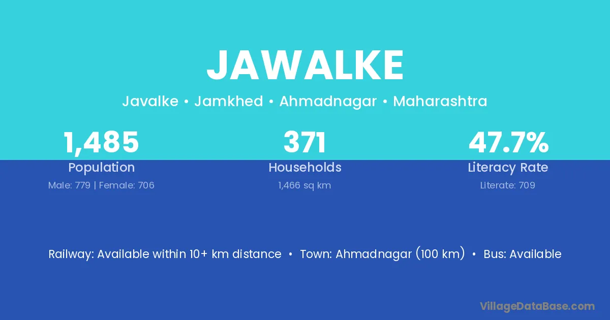 Ahmadnagar (100 km) is the nearest town to Jawalke village for major economic activities and is located approximately 100 km away.