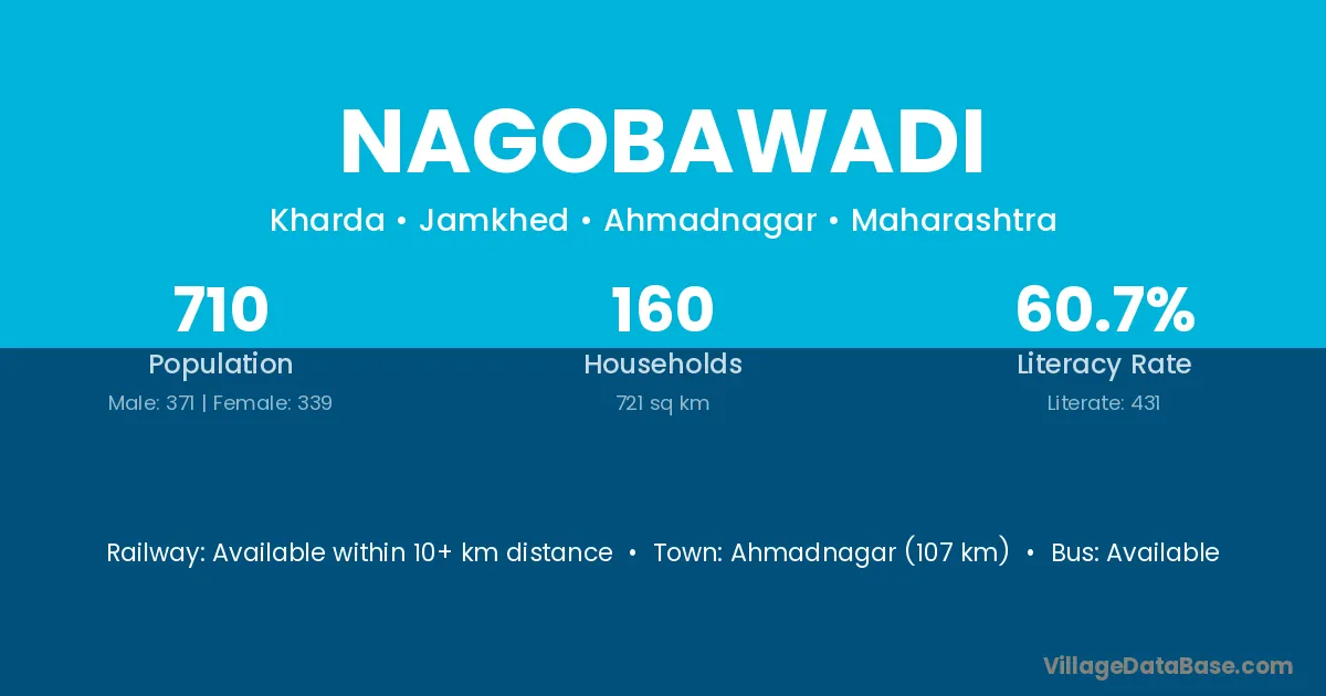 Ahmadnagar (107 km) is the nearest town to Nagobawadi village for major economic activities and is located approximately 107 km away.