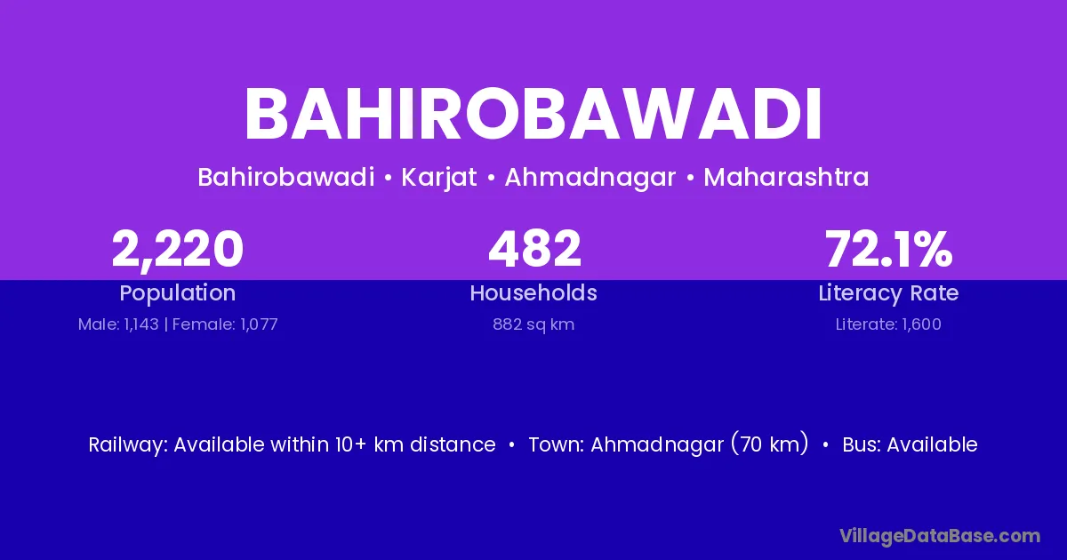 Ahmadnagar (70 km) is the nearest town to Bahirobawadi village for major economic activities and is located approximately 70 km away.