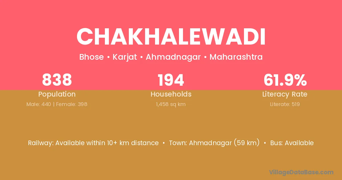 Ahmadnagar (59 km) is the nearest town to Chakhalewadi village for major economic activities and is located approximately 59 km away.