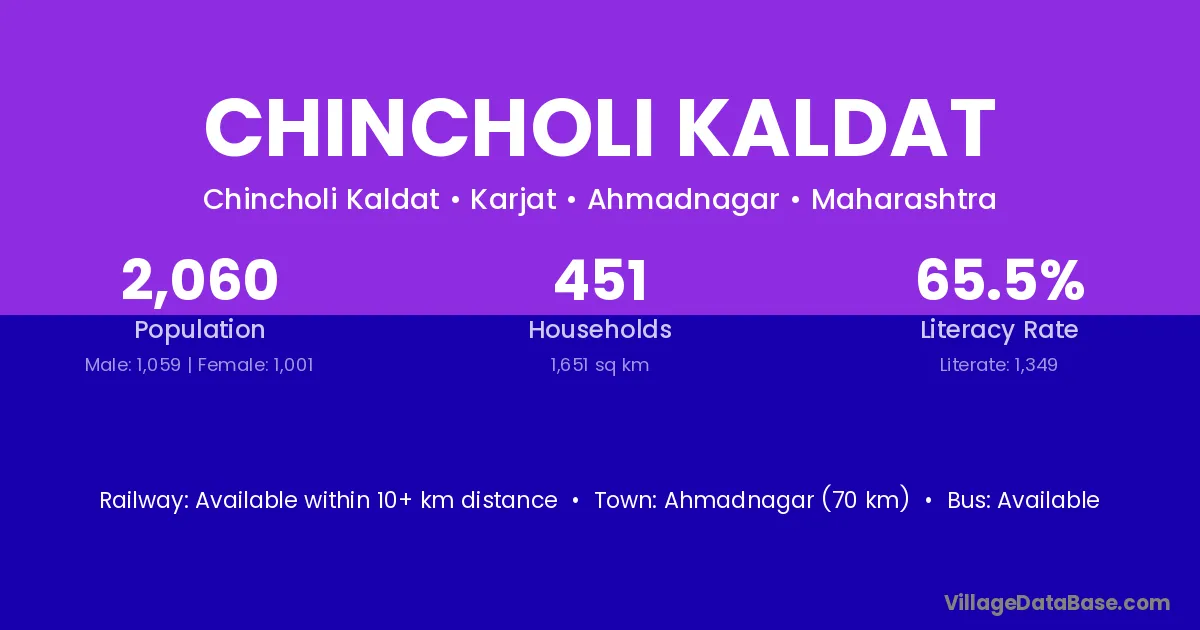 Ahmadnagar (70 km) is the nearest town to Chincholi Kaldat village for major economic activities and is located approximately 70 km away.