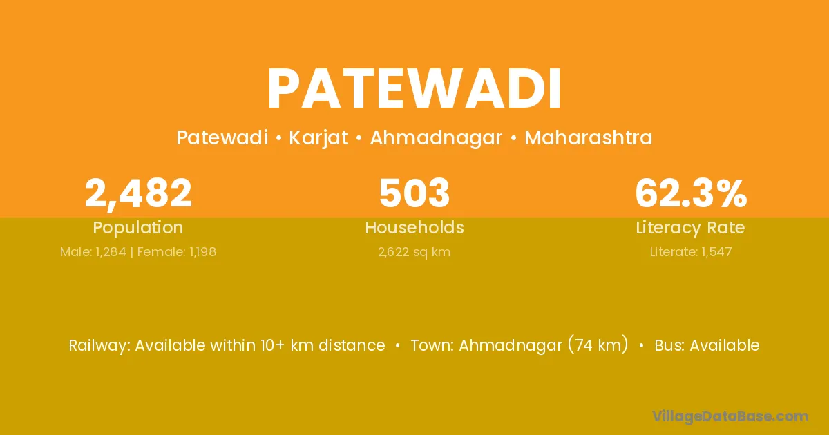 Ahmadnagar (74 km) is the nearest town to Patewadi village for major economic activities and is located approximately 74 km away.