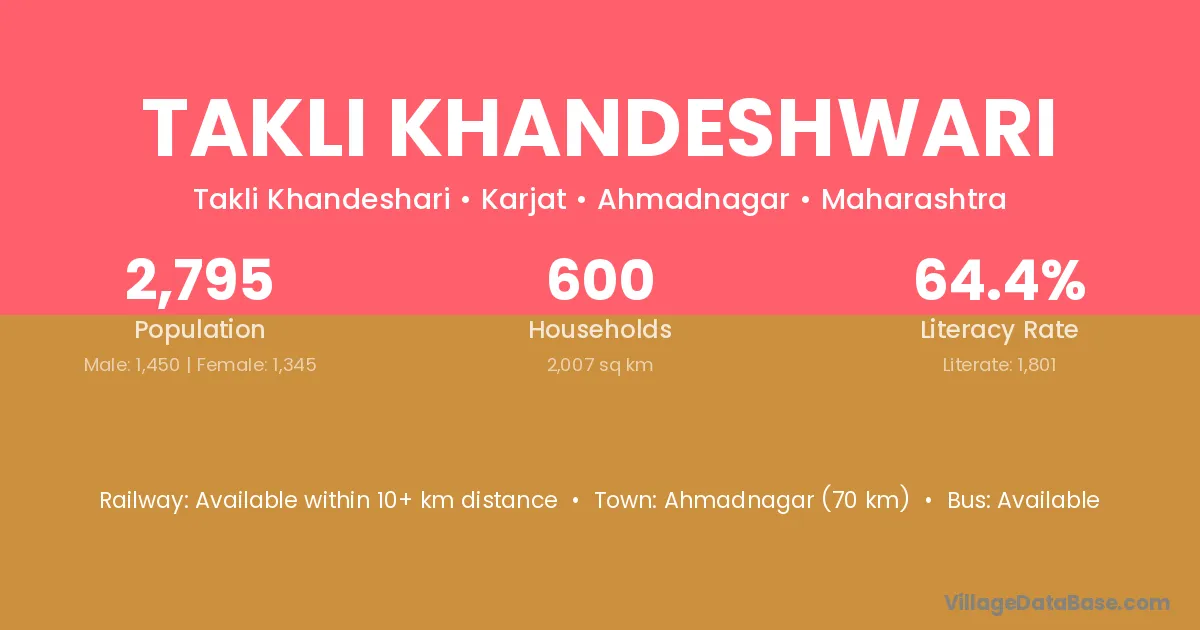 Ahmadnagar (70 km) is the nearest town to Takli Khandeshwari village for major economic activities and is located approximately 70 km away.