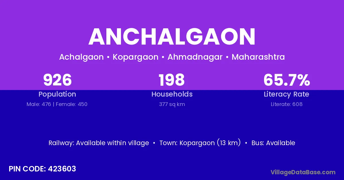 Kopargaon (13 km) is the nearest town to Anchalgaon village for major economic activities and is located approximately 13 km away.