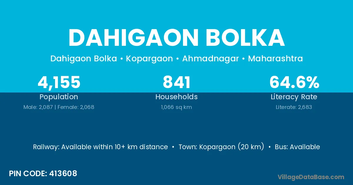 Kopargaon (20 km) is the nearest town to Dahigaon Bolka village for major economic activities and is located approximately 20 km away.