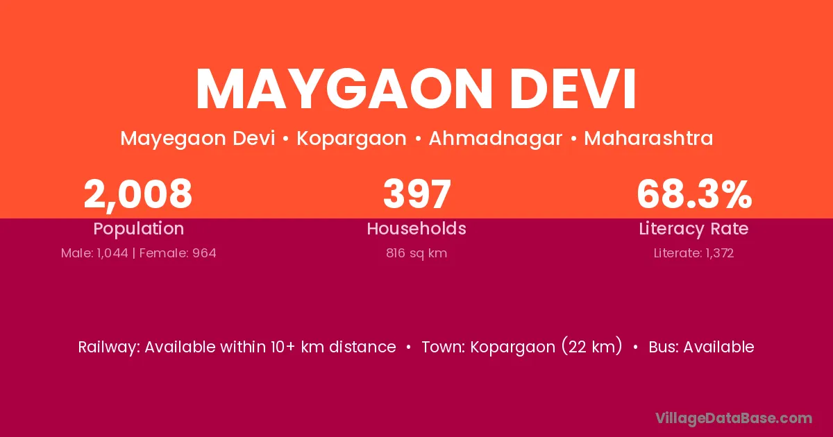 Kopargaon (22 km) is the nearest town to Maygaon Devi village for major economic activities and is located approximately 22 km away.