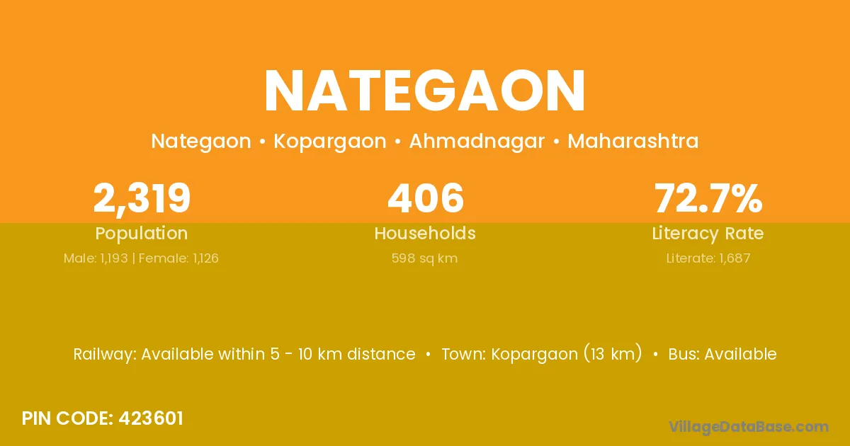 Kopargaon (13 km) is the nearest town to Nategaon village for major economic activities and is located approximately 13 km away.