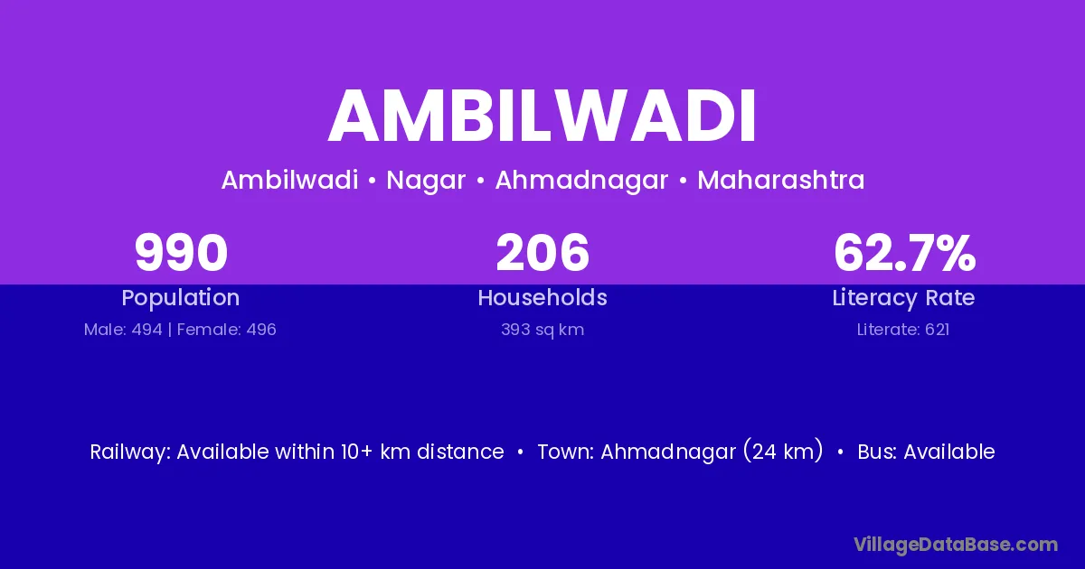 Ambilwadi village has a total population of 990 people, of which 494 are males and 496 are females.