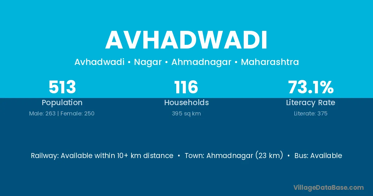 Ahmadnagar (23 km) is the nearest town to Avhadwadi village for major economic activities and is located approximately 23 km away.