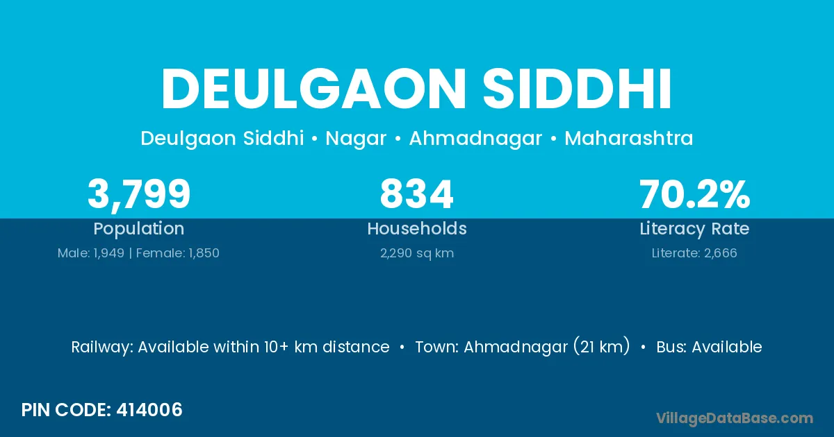 Ahmadnagar (21 km) is the nearest town to Deulgaon Siddhi village for major economic activities and is located approximately 21 km away.