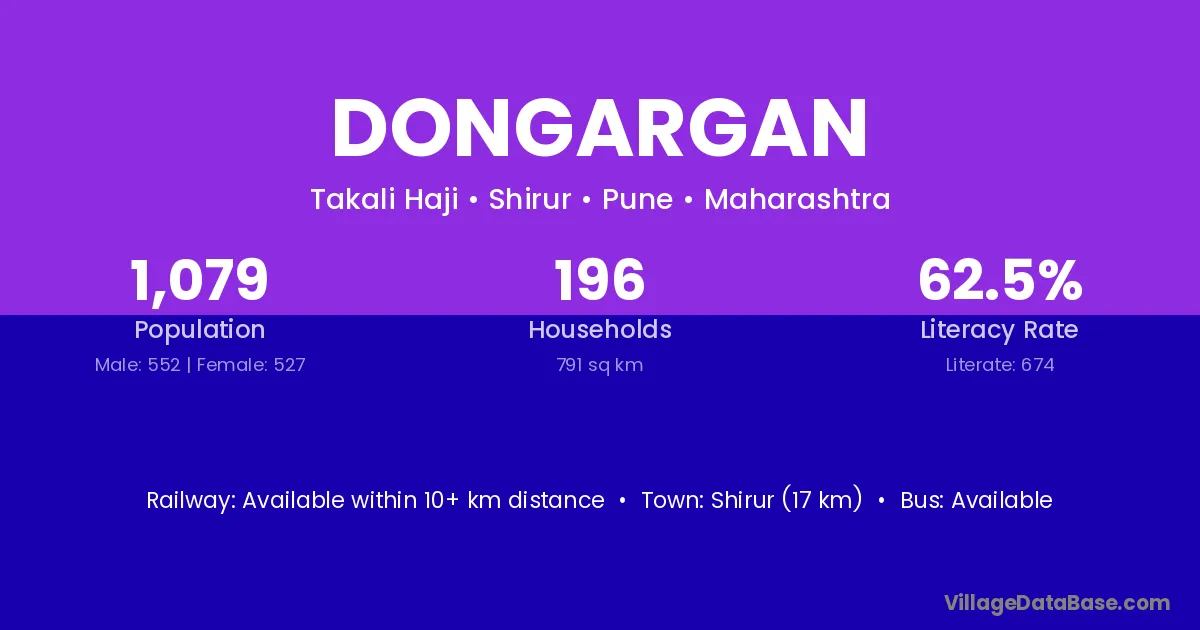 Ahmadnagar (20 km) is the nearest town to Dongargan village for major economic activities and is located approximately 20 km away.