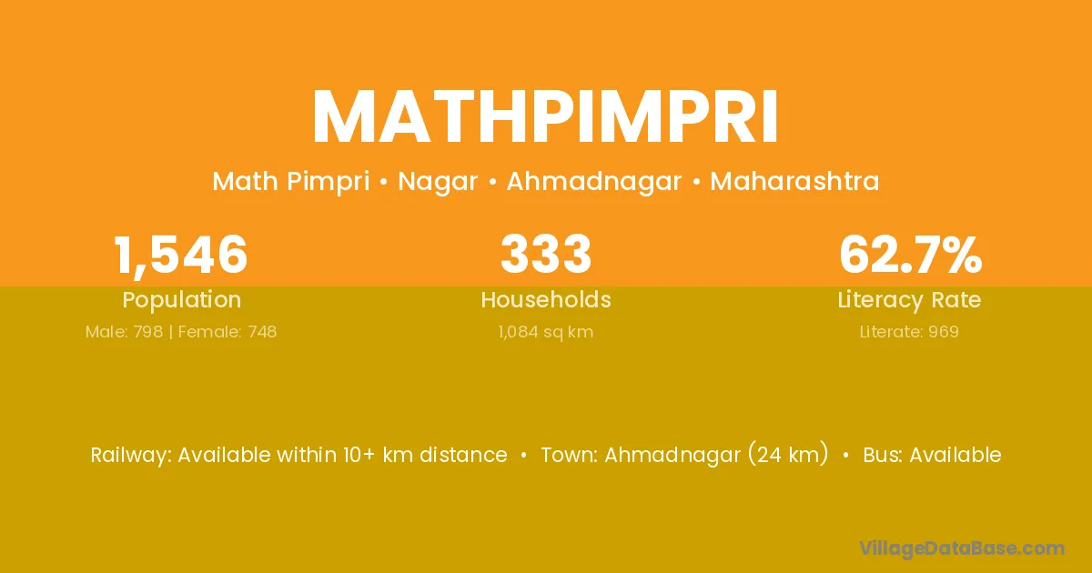 Ahmadnagar (24 km) is the nearest town to Mathpimpri village for major economic activities and is located approximately 24 km away.