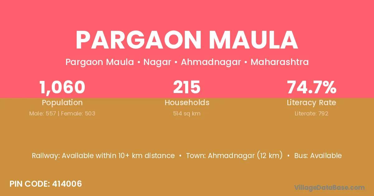 Ahmadnagar (12 km) is the nearest town to Pargaon Maula village for major economic activities and is located approximately 12 km away.