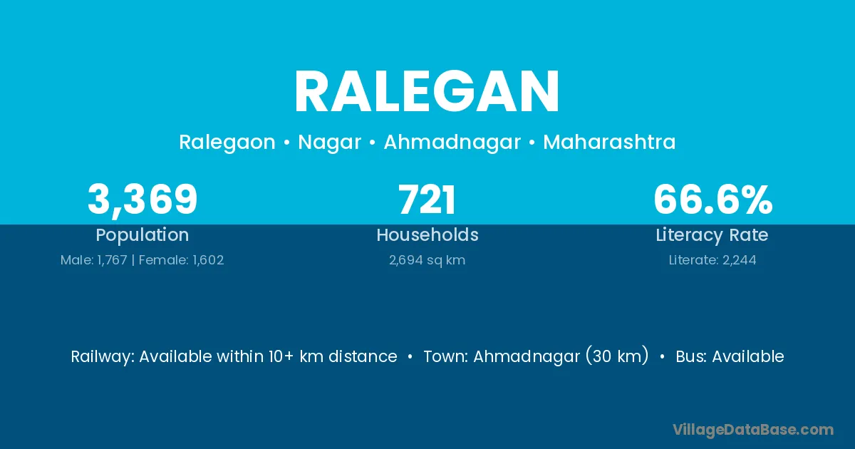 Ahmadnagar (30 km) is the nearest town to Ralegan village for major economic activities and is located approximately 30 km away.