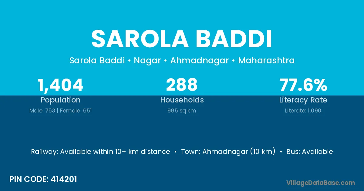 Ahmadnagar (10 km) is the nearest town to Sarola Baddi village for major economic activities and is located approximately 10 km away.