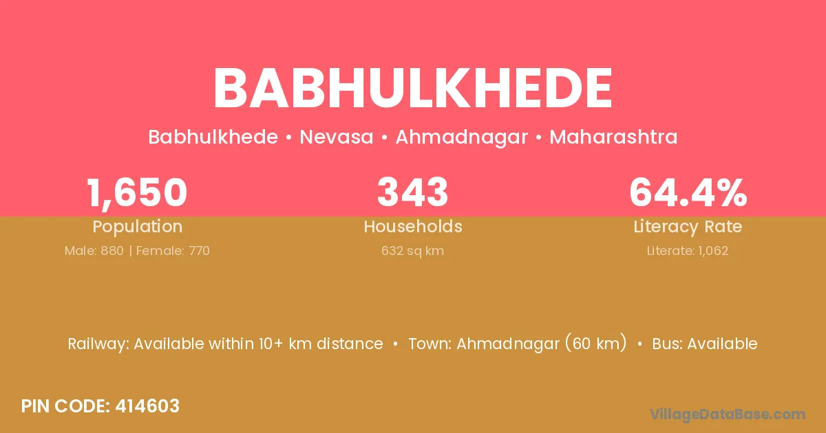 Ahmadnagar (60 km) is the nearest town to Babhulkhede village for major economic activities and is located approximately 60 km away.