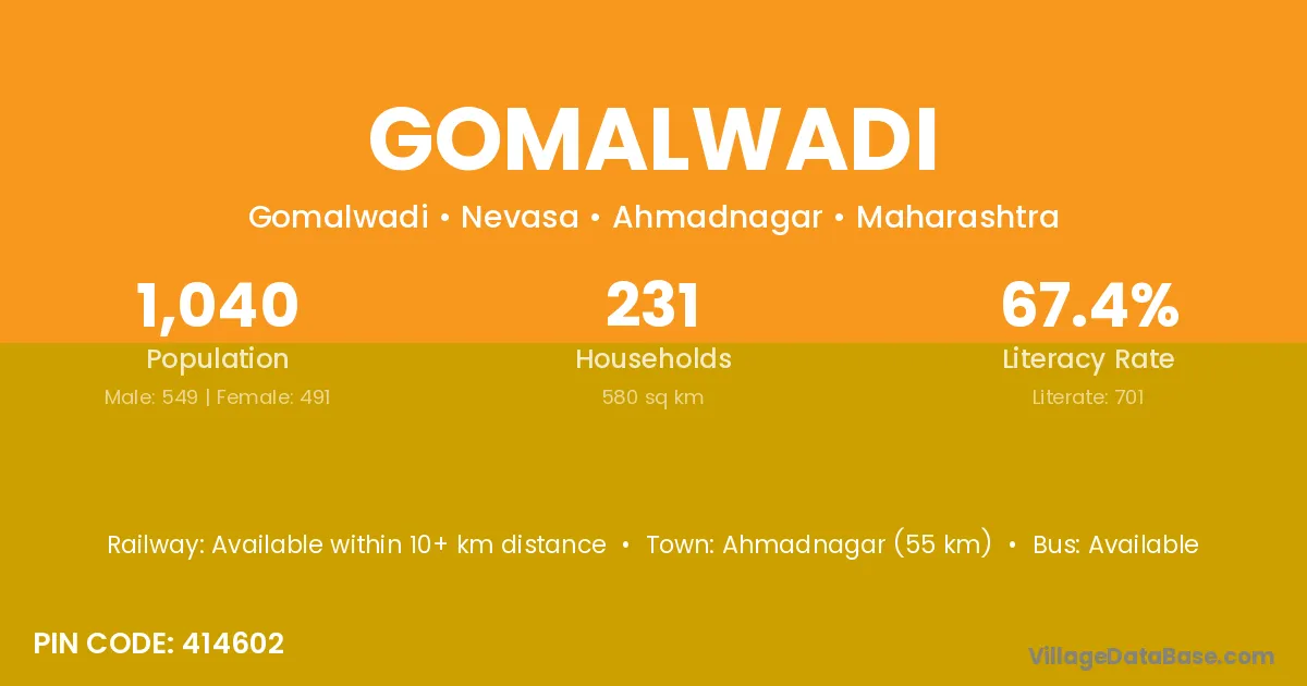 Ahmadnagar (55 km) is the nearest town to Gomalwadi village for major economic activities and is located approximately 55 km away.