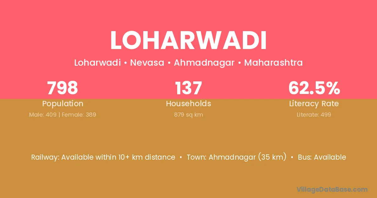 Ahmadnagar (35 km) is the nearest town to Loharwadi village for major economic activities and is located approximately 35 km away.