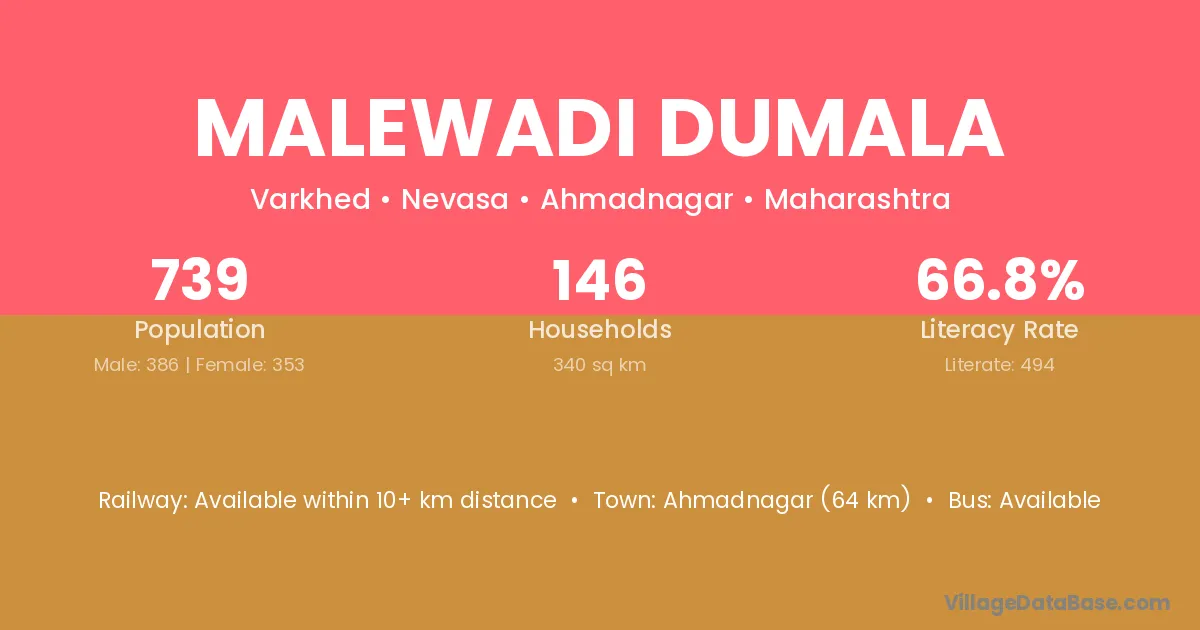 Ahmadnagar (64 km) is the nearest town to Malewadi Dumala village for major economic activities and is located approximately 64 km away.