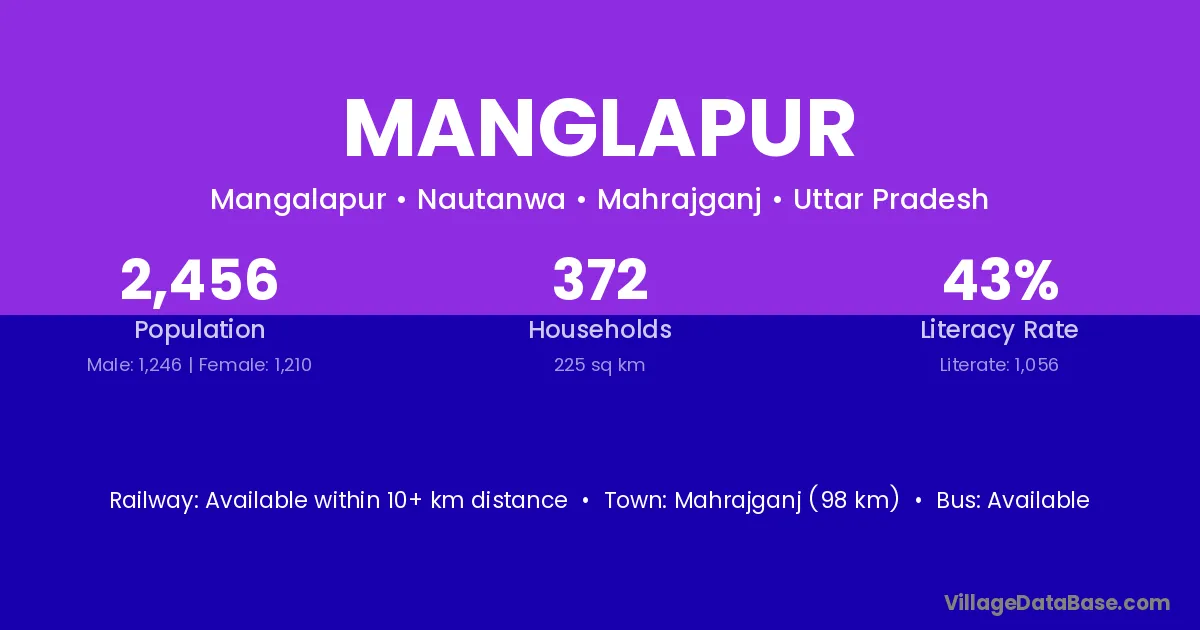 Manglapur village has a total population of 1,019 people, of which 510 are males and 509 are females.