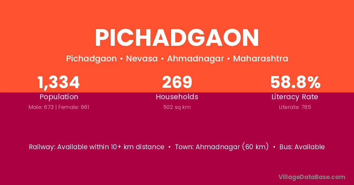 Ahmadnagar (60 km) is the nearest town to Pichadgaon village for major economic activities and is located approximately 60 km away.