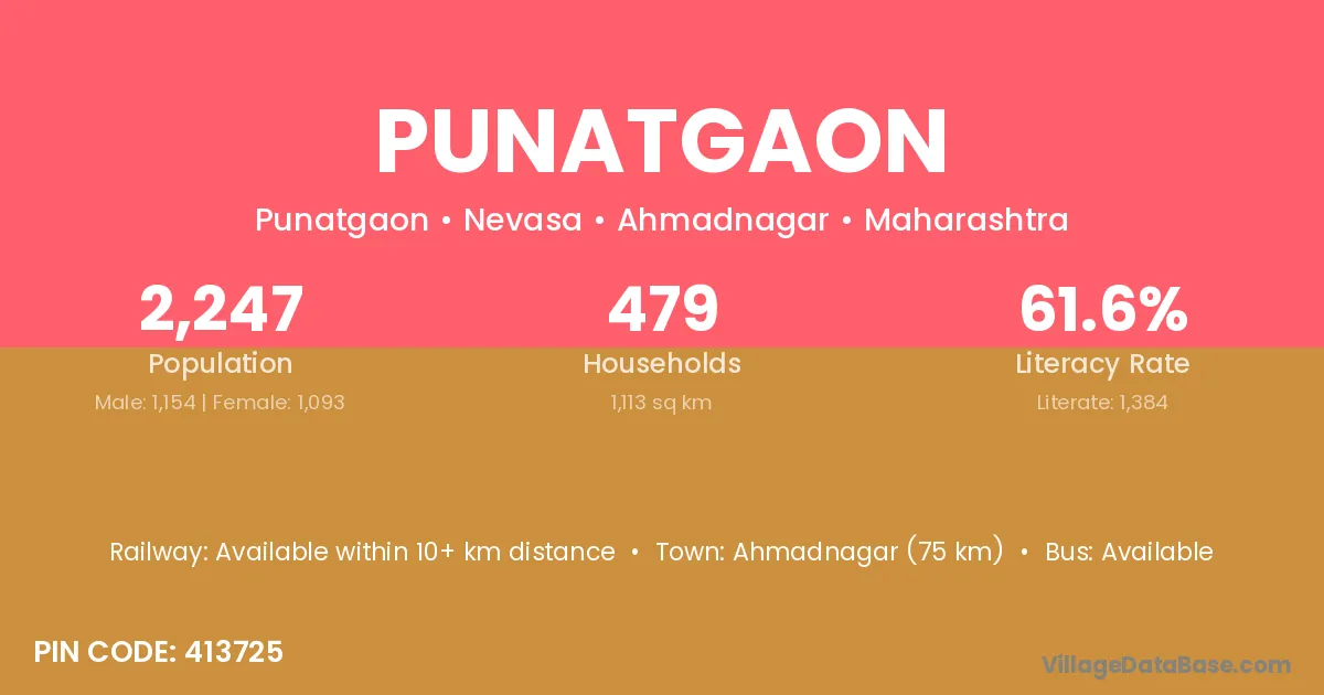 Ahmadnagar (75 km) is the nearest town to Punatgaon village for major economic activities and is located approximately 75 km away.