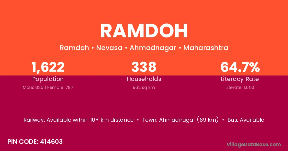 Ahmadnagar (69 km) is the nearest town to Ramdoh village for major economic activities and is located approximately 69 km away.
