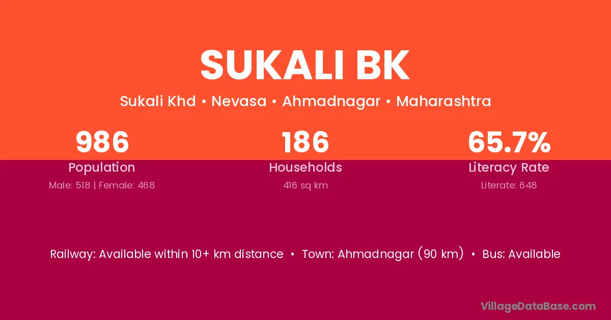 Ahmadnagar (90 km) is the nearest town to Sukali Bk village for major economic activities and is located approximately 90 km away.