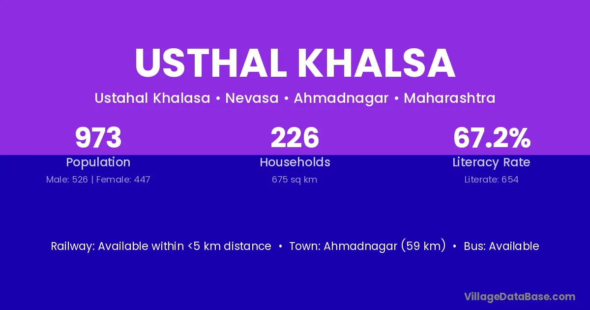 Ahmadnagar (59 km) is the nearest town to Usthal Khalsa village for major economic activities and is located approximately 59 km away.