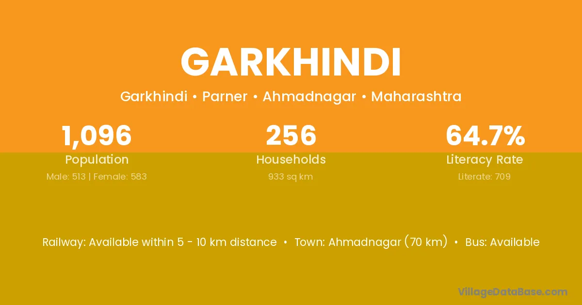 Ahmadnagar (70 km) is the nearest town to Garkhindi village for major economic activities and is located approximately 70 km away.