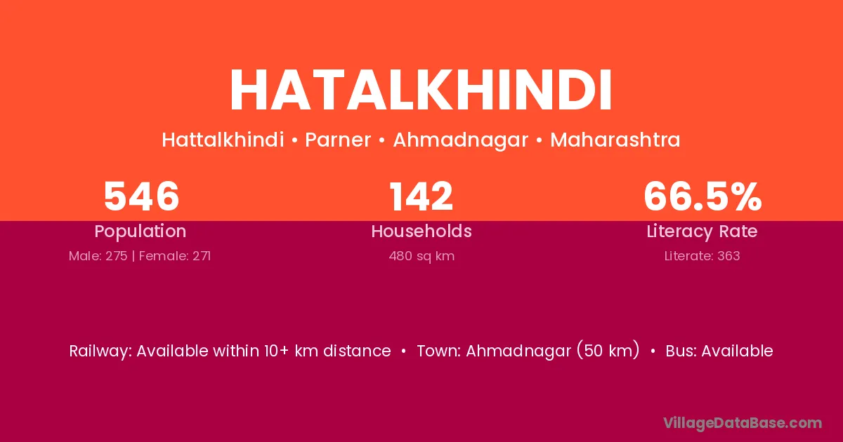 Ahmadnagar (50 km) is the nearest town to Hatalkhindi village for major economic activities and is located approximately 50 km away.