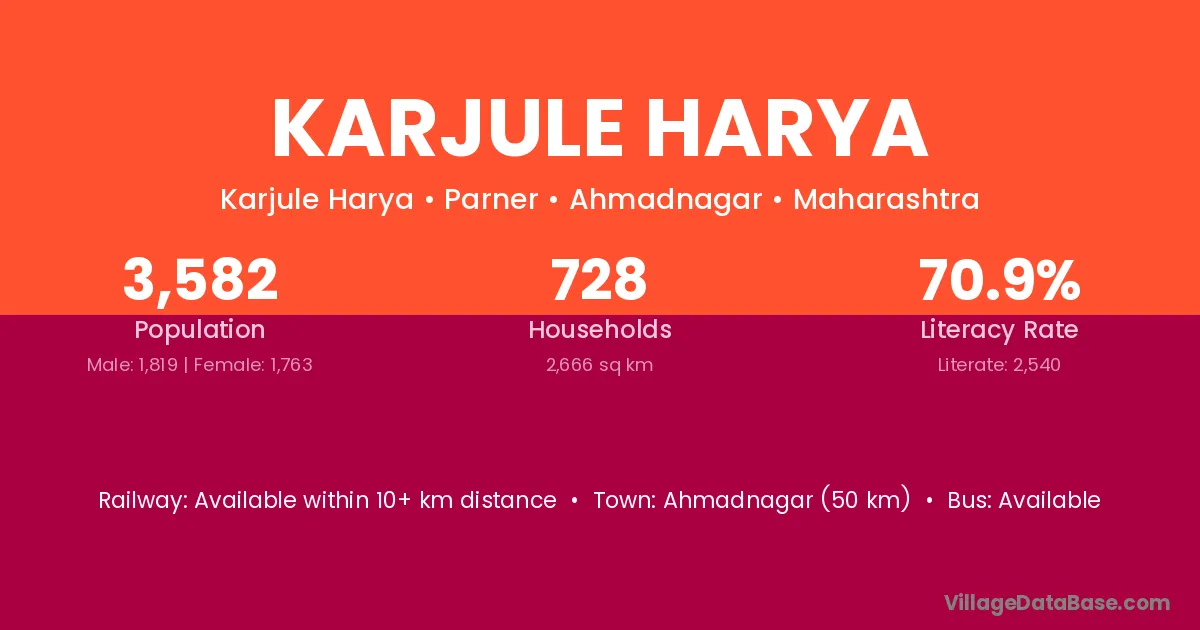 Ahmadnagar (50 km) is the nearest town to Karjule Harya village for major economic activities and is located approximately 50 km away.