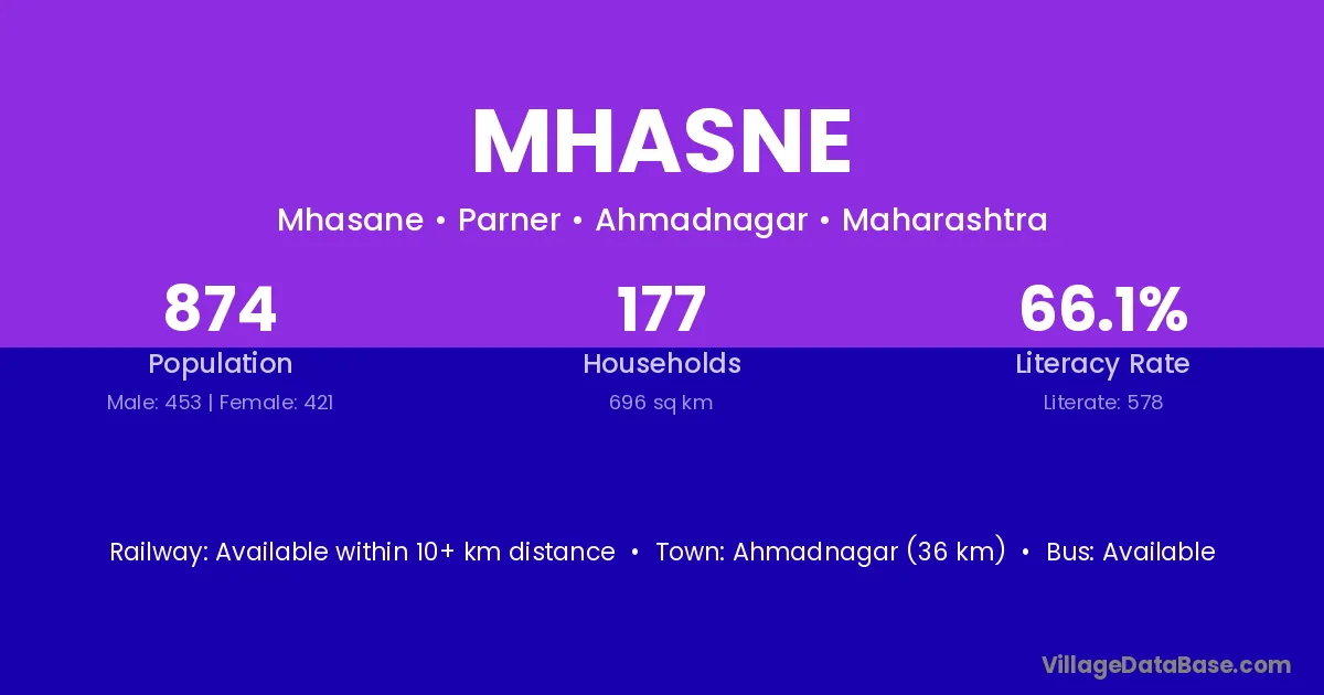 Ahmadnagar (36 km) is the nearest town to Mhasne village for major economic activities and is located approximately 36 km away.