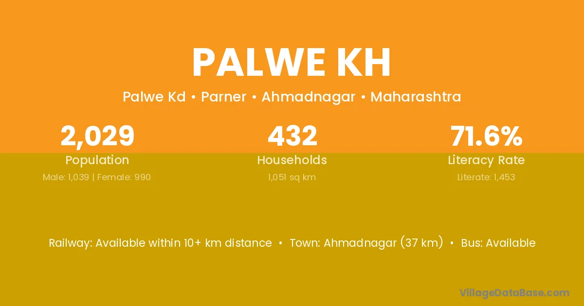 Ahmadnagar (37 km) is the nearest town to Palwe Kh village for major economic activities and is located approximately 37 km away.