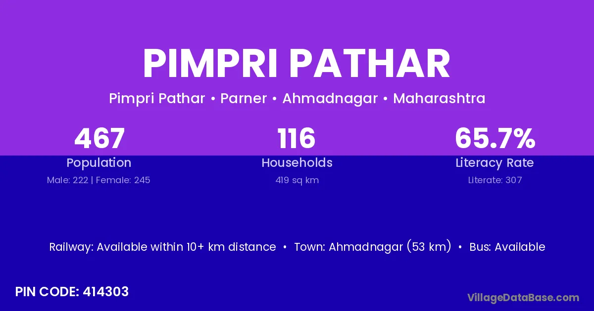 Ahmadnagar (53 km) is the nearest town to Pimpri Pathar village for major economic activities and is located approximately 53 km away.