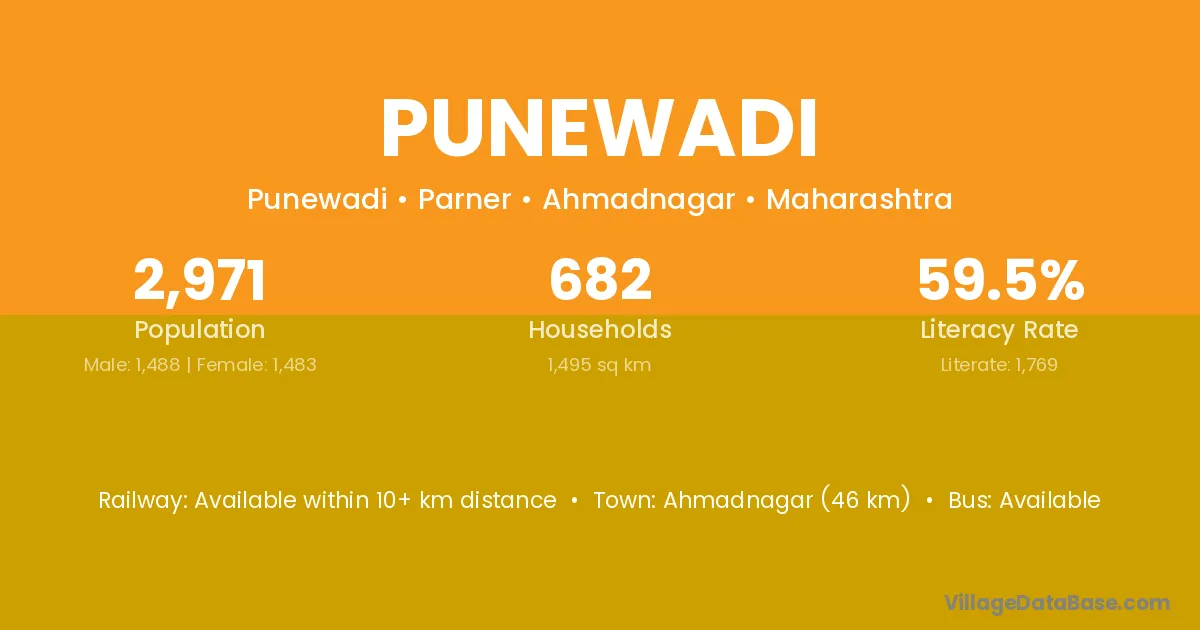 Ahmadnagar (46 km) is the nearest town to Punewadi village for major economic activities and is located approximately 46 km away.