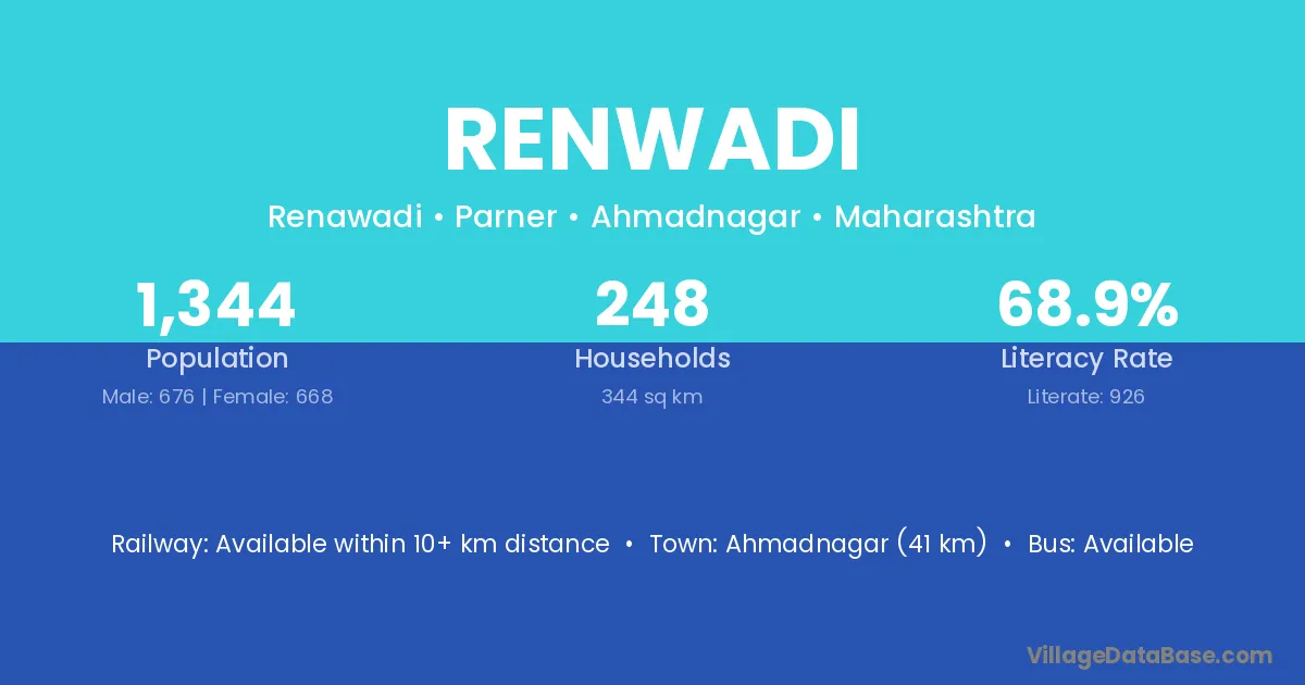 Ahmadnagar (41 km) is the nearest town to Renwadi village for major economic activities and is located approximately 41 km away.