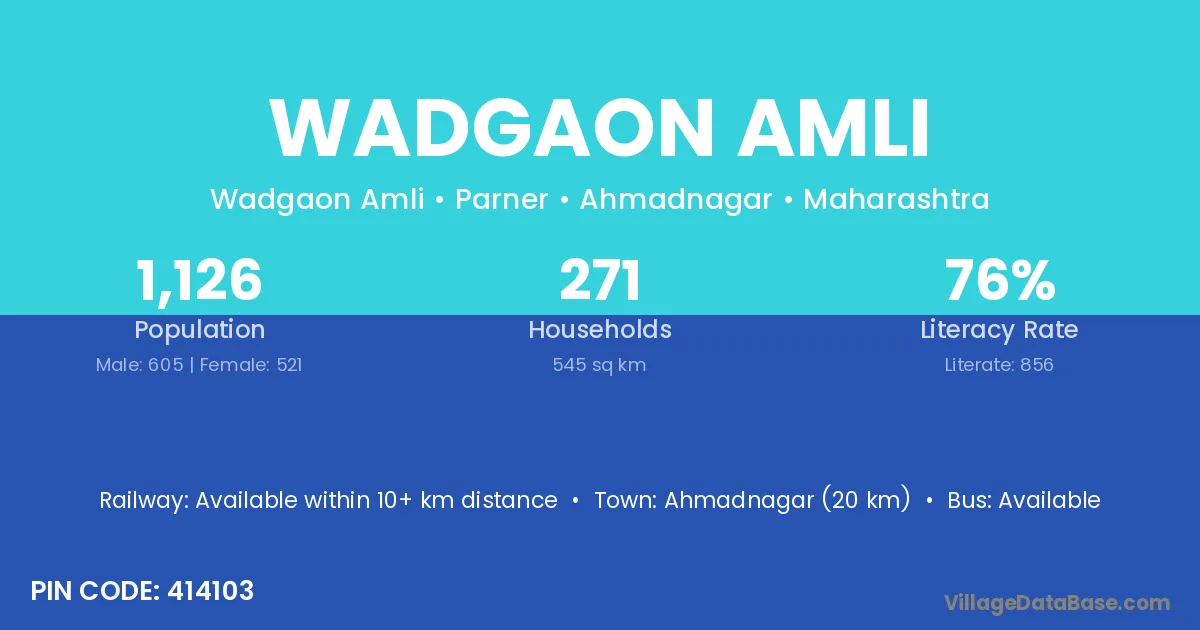 Ahmadnagar (20 km) is the nearest town to Wadgaon Amli village for major economic activities and is located approximately 20 km away.