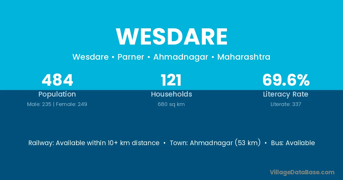 Ahmadnagar (53 km) is the nearest town to Wesdare village for major economic activities and is located approximately 53 km away.