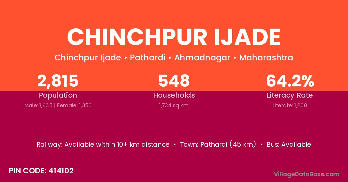 Pathardi (45 km) is the nearest town to Chinchpur Ijade village for major economic activities and is located approximately 45 km away.