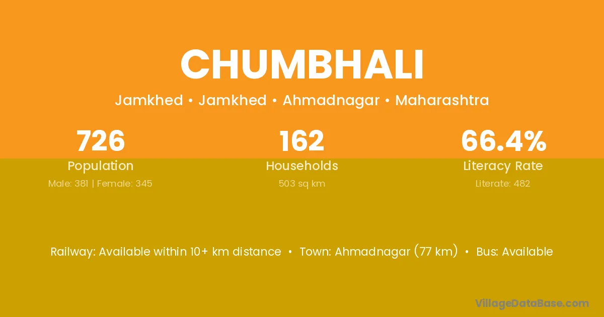 Pathardi (26 km) is the nearest town to Chumbhali village for major economic activities and is located approximately 26 km away.