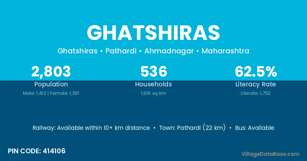Pathardi (22 km) is the nearest town to Ghatshiras village for major economic activities and is located approximately 22 km away.