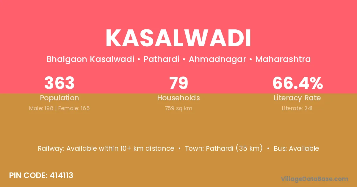 Pathardi (35 km) is the nearest town to Kasalwadi village for major economic activities and is located approximately 35 km away.