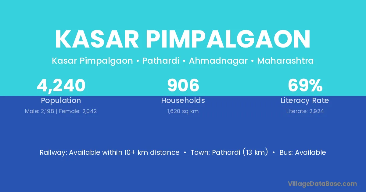Pathardi (13 km) is the nearest town to Kasar Pimpalgaon village for major economic activities and is located approximately 13 km away.